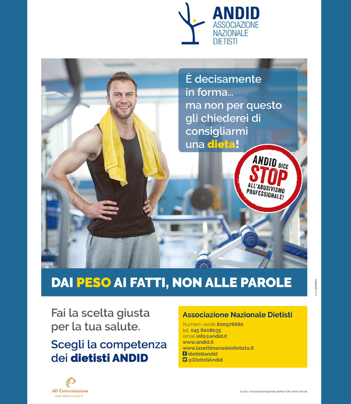 In occasione della Settimana del Dietista, che si svolge fino a lunedì 23 ottobre 2017, l’Associazione Nazionale Dietisti (ANDID) scende in campo sul delicato tema dell’abusivismo professionale. Per l’occasione è stata realizzata la campagna di comunicazione web Fai la scelta giusta. Dai peso ai fatti, che intende contrastare l’abitudine di alcune categorie professionali, che lavorano principalmente nel settore del benessere, a fornire suggerimenti e consigli dietetici ai loro clienti, pur non avendone competenza e mettendo a rischio la loro salute.