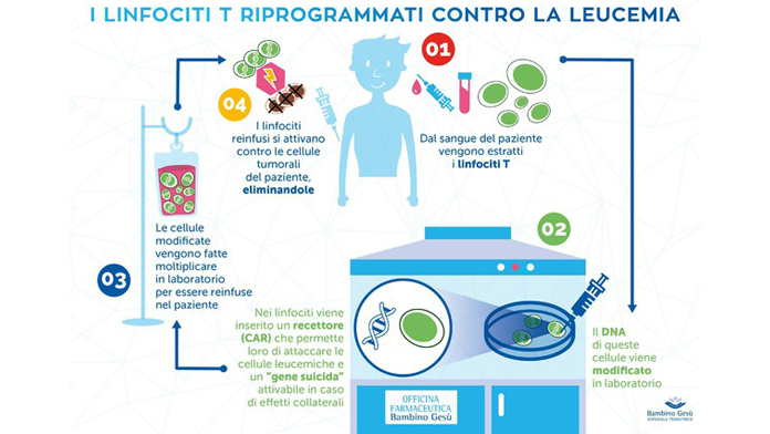 Il team del Bambino Gesù ha prelevato i linfociti T del piccolo paziente – le cellule fondamentali della risposta immunitaria – e li hanno modificati geneticamente in laboratorio. Hanno utilizzato un recettore, chiamato CAR (Chimeric Antigenic Receptor), che potenzia i linfociti e li rende in grado – una volta reinfusi nel paziente – di riconoscere e attaccare le cellule tumorali presenti nel sangue e nel midollo, fino a eliminarle completamente.
